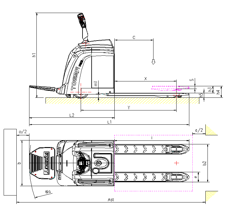 | 直角堆垛通道寬度,托盤(pán)800x1200(1200沿貨叉邊) | Ast mm | 2550 | |||