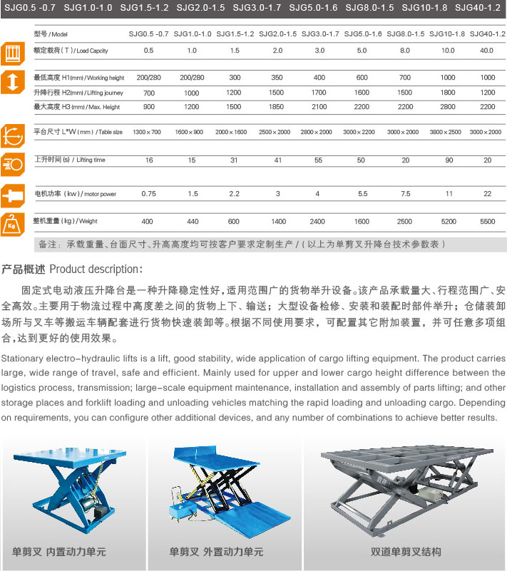 固定式電動液壓升降臺是一種升降穩定性好,適用范圍廣的貨物舉升設備。該產品承載量大、行程范圍廣、安全高效。主要用于物流過程中高度差之間的貨物上下、輸送;大型設備檢修、安裝和裝配時部件舉升;倉儲裝卸場所與叉車等搬運車輛配套進行貨物快速裝卸等。根據不同使用要求,可配置其它附加裝置,并可任意多項組合,達到更好的使用效果。